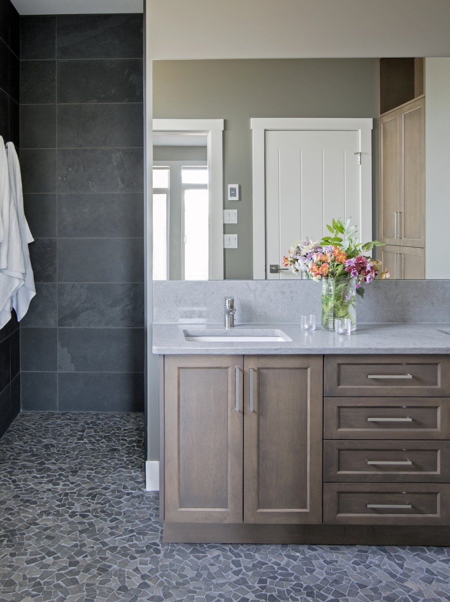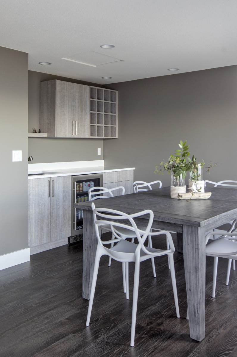 Here’s a look at a custom home we built in Qualicum Beach. The interior of this oceanfront property features cool greys and sandy tans that are contrasted with bright whites and accents of distressed wood that is reminiscent of West Coast driftwood. An electric fireplace serves as the accent of the living room and features a floor-to-ceiling surround that resembles the sand rippled beaches of Parksville.